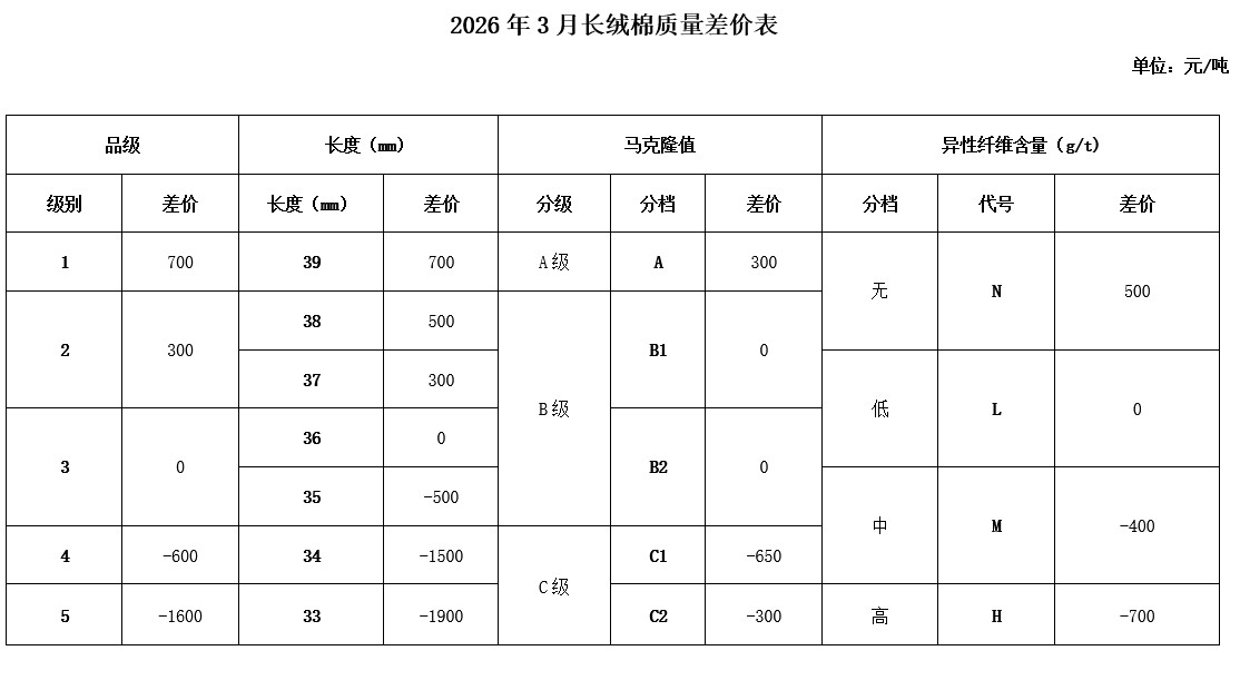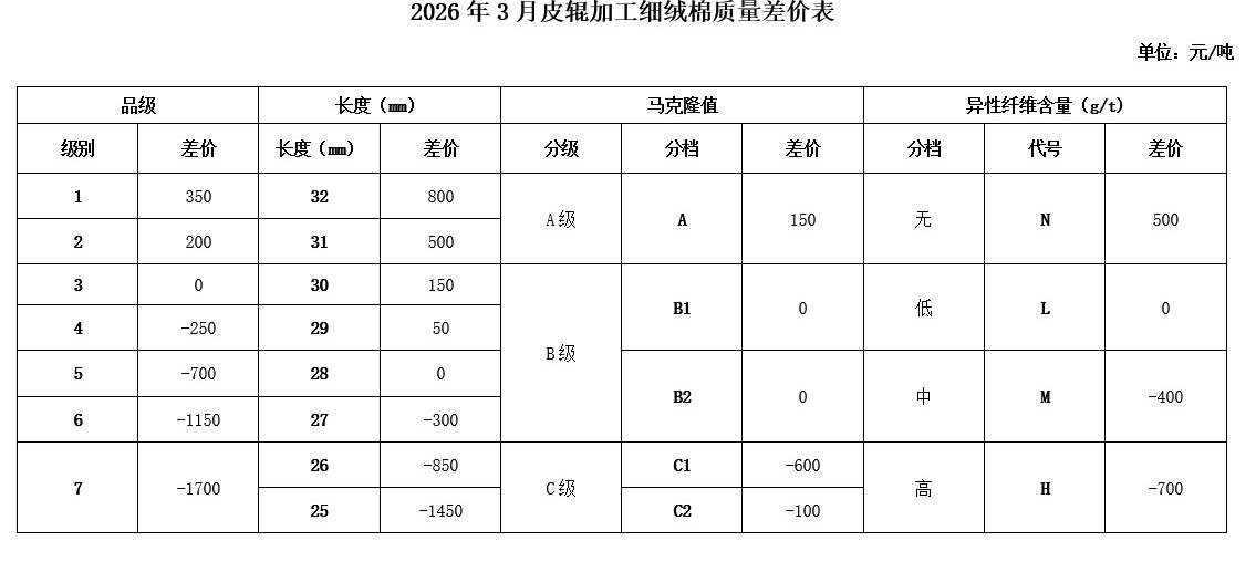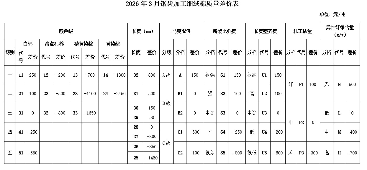 根據(jù)《中國棉花協(xié)會國產(chǎn)棉質(zhì)量差價表管理辦法》規(guī)定,現(xiàn)正式發(fā)布2026年3月《鋸齒加工細絨棉質(zhì)量差價表》、《皮輥加工細絨棉質(zhì)量差價表》、《長絨棉質(zhì)量差價表》(單位:元/噸)。