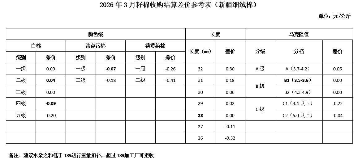 依據(jù)中國棉花協(xié)會發(fā)布的2026年3月《鋸齒加工細(xì)絨棉質(zhì)量差價表》和2025年9月-2026年2月新疆籽棉平均公定衣分率,折算得出籽棉收購差價,與上月相比,差價保持不變。