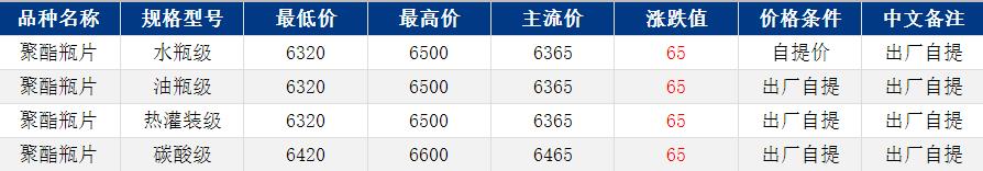 華東聚酯瓶片收于6365元/噸,漲跌值65元/噸,地緣局勢(shì)影響,原油大幅上漲。成本推動(dòng)下,聚酯瓶片工廠報(bào)價(jià)上調(diào)50-100元/噸,重心隨之上揚(yáng)。3月貨源報(bào)盤(pán)6300-6500元/噸,主流貨源6350元/噸左右,遞盤(pán)6300-6320元/噸。