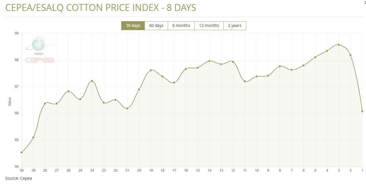 3月3日(周二),巴西CEPEA/ESALQ棉花價格指數(shù)報66.08美分/磅,較前一交易日下跌3.09%,較上月同期下跌3.65%。