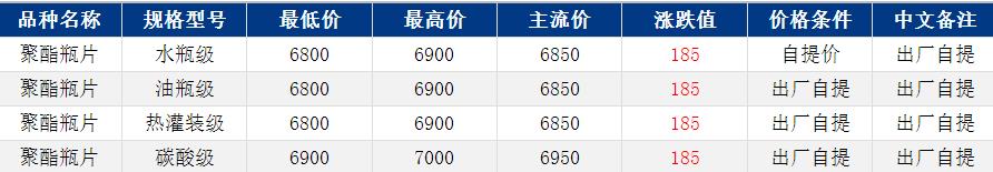 華東聚酯瓶片收于6850元/噸,漲跌值185元/噸,原油繼續(xù)上漲,疊加PX某大廠1套裝置停車檢修,原料強勢大幅上行。成本推動下,聚酯瓶片工廠報價上行200-370元/噸,重心隨之上行。3月貨源報盤6800-7000元/噸,早間6850元/噸商談。