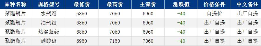 華東聚酯瓶片收于6960元/噸,漲跌值-40元/噸,原料仍存支撐,聚酯瓶片工廠部分持穩(wěn),部分下調(diào)30元/噸,重心窄幅下滑。3月貨源報(bào)盤6850-7050元/噸,早間主流貨源6850-6900元/噸,隨著原料價(jià)格上行,主流貨源出貨價(jià)上調(diào)到至6950元/噸附近。遞盤6880-6900元/噸;或期貨合約2605升水100-150。