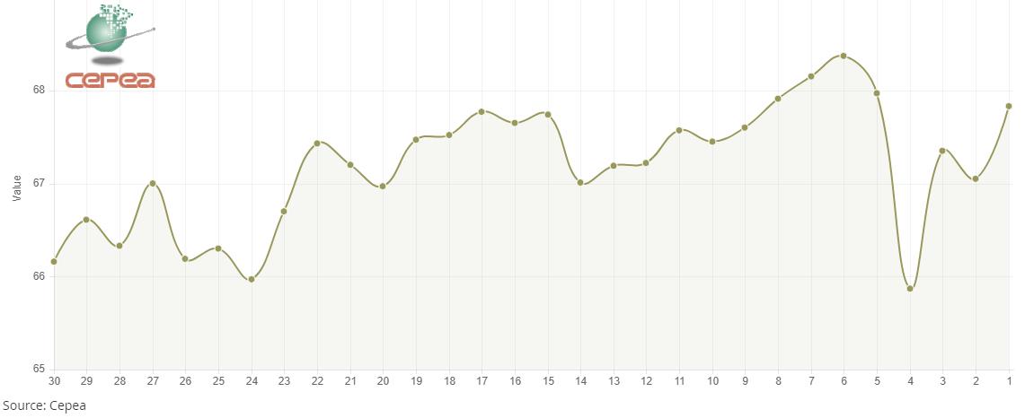3月6日(周五),巴西CEPEA/ESALQ棉花價(jià)格指數(shù)報(bào)67.83美分/磅,較前一交易日上漲1.16%,較上月同期下跌0.79%。