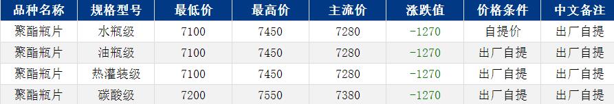華東聚酯瓶片收于7280元/噸,漲跌值-1270元/噸,外圍消息影響,原油大幅回落,拖累原料端下行。聚酯瓶片工廠大部分暫未出價(jià),三房巷遠(yuǎn)月報(bào)7500元/噸,市場(chǎng)重心大幅下滑。3月貨源報(bào)盤7100-7450元/噸,持貨商出貨為主,未見實(shí)單遞盤。行情波動(dòng)劇大,業(yè)內(nèi)觀望情緒濃厚。