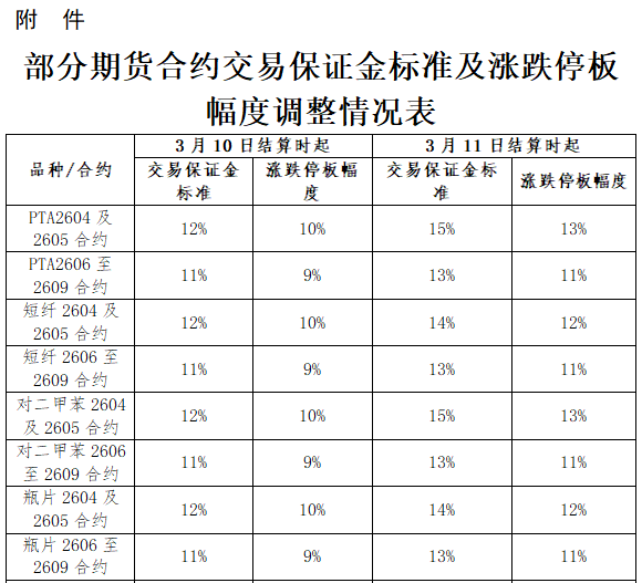 二、自2026年3月11日結(jié)算時起,PTA期貨2604、2605合約的交易保證金標準調(diào)整為15%,漲跌停板幅度調(diào)整為13%;PTA期貨2606、2607、2608、2609合約的交易保證金標準調(diào)整為13%,漲跌停板幅度調(diào)整為11%;短纖期貨2604、2605合約的交易保證金標準調(diào)整為14%,漲跌停板幅度調(diào)整為12%;短纖期貨2606、2607、2608、2609合約的交易保證金標準調(diào)整為13%,漲跌停板幅度調(diào)整為11%;對二甲苯期貨2604、2605合約的交易保證金標準調(diào)整為15%,漲跌停板幅度調(diào)整為13%;對二甲苯期貨2606、2607、2608、2609合約的交易保證金標準調(diào)整為13%,漲跌停板幅度調(diào)整為11%;瓶片期貨2604、2605合約的交易保證金標準調(diào)整為14%,漲跌停板幅度調(diào)整為12%;瓶片期貨2606、2607、2608、2609合約的交易保證金標準調(diào)整為13%,漲跌停板幅度調(diào)整為11%。