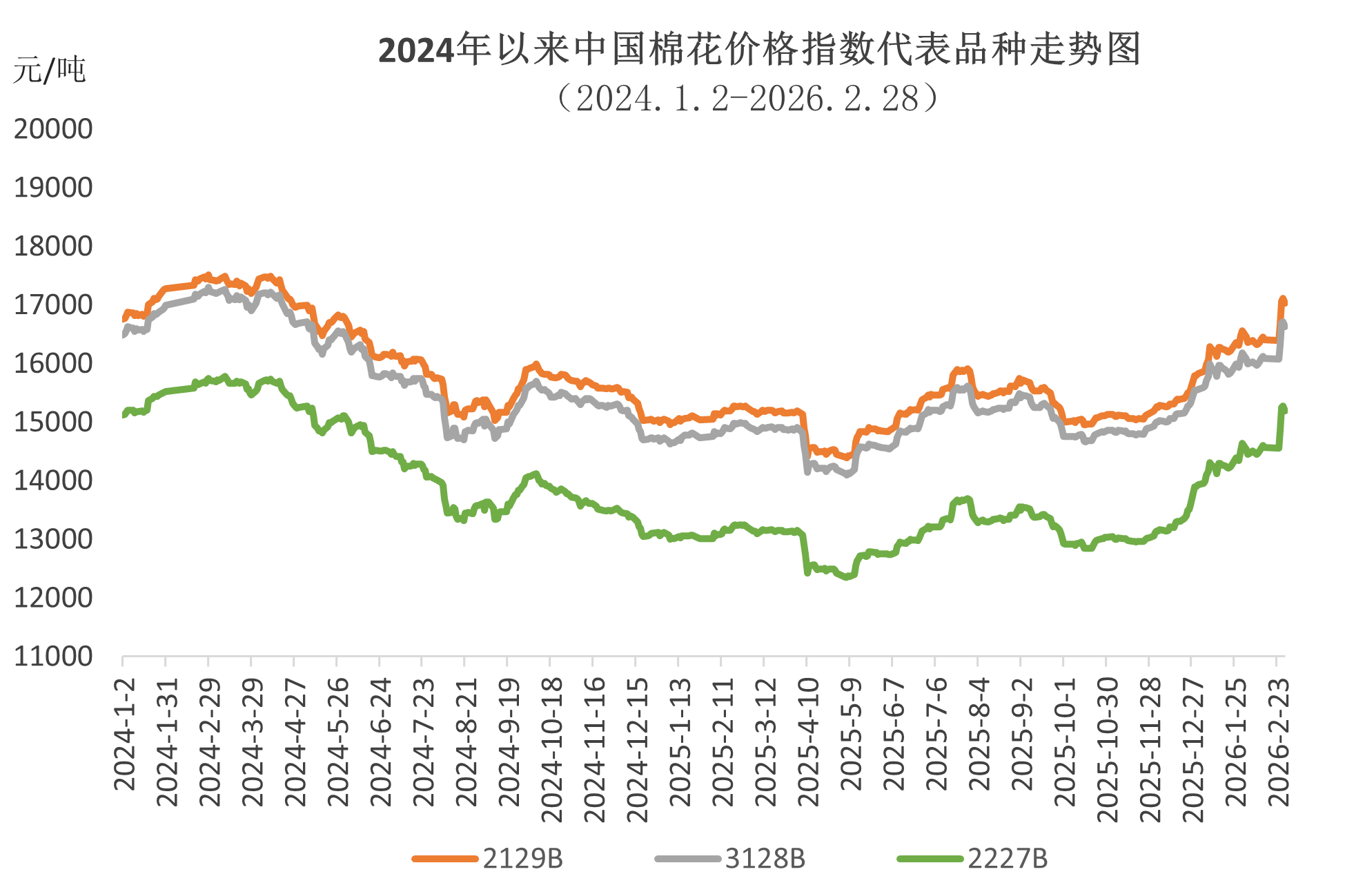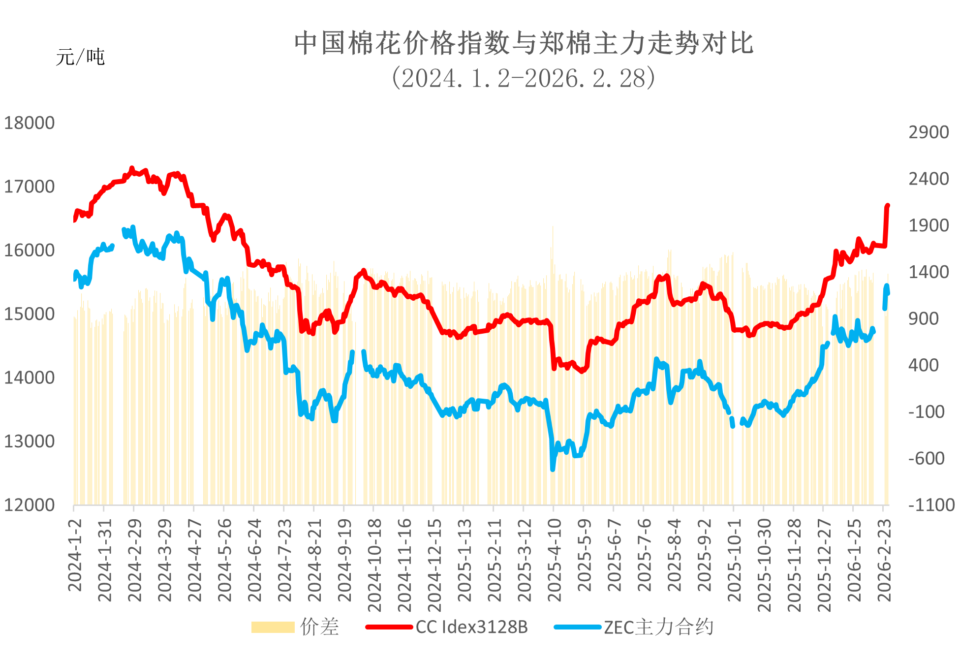 2月鄭棉呈震蕩走穩(wěn)、月末大幅攀升的走勢(shì),全月重心顯著上移。月初受春節(jié)假期影響震蕩偏弱,下旬中東局勢(shì)緊張引發(fā)地緣風(fēng)險(xiǎn),疊加國(guó)內(nèi)穩(wěn)增長(zhǎng)政策托底、消費(fèi)回暖預(yù)期增強(qiáng),資金涌入推動(dòng)期價(jià)快速?zèng)_高。鄭棉主力月內(nèi)最低14500元/噸,最高15665元/噸,最大漲幅8%。月末鄭棉主力結(jié)算價(jià)15260元/噸,低于同期中國(guó)棉花價(jià)格指數(shù)1383元/噸,兩者價(jià)差環(huán)比縮小30元/噸。鄭棉主力合約月均結(jié)算價(jià)14856元/噸,環(huán)比上漲152元,同比上漲1115元。