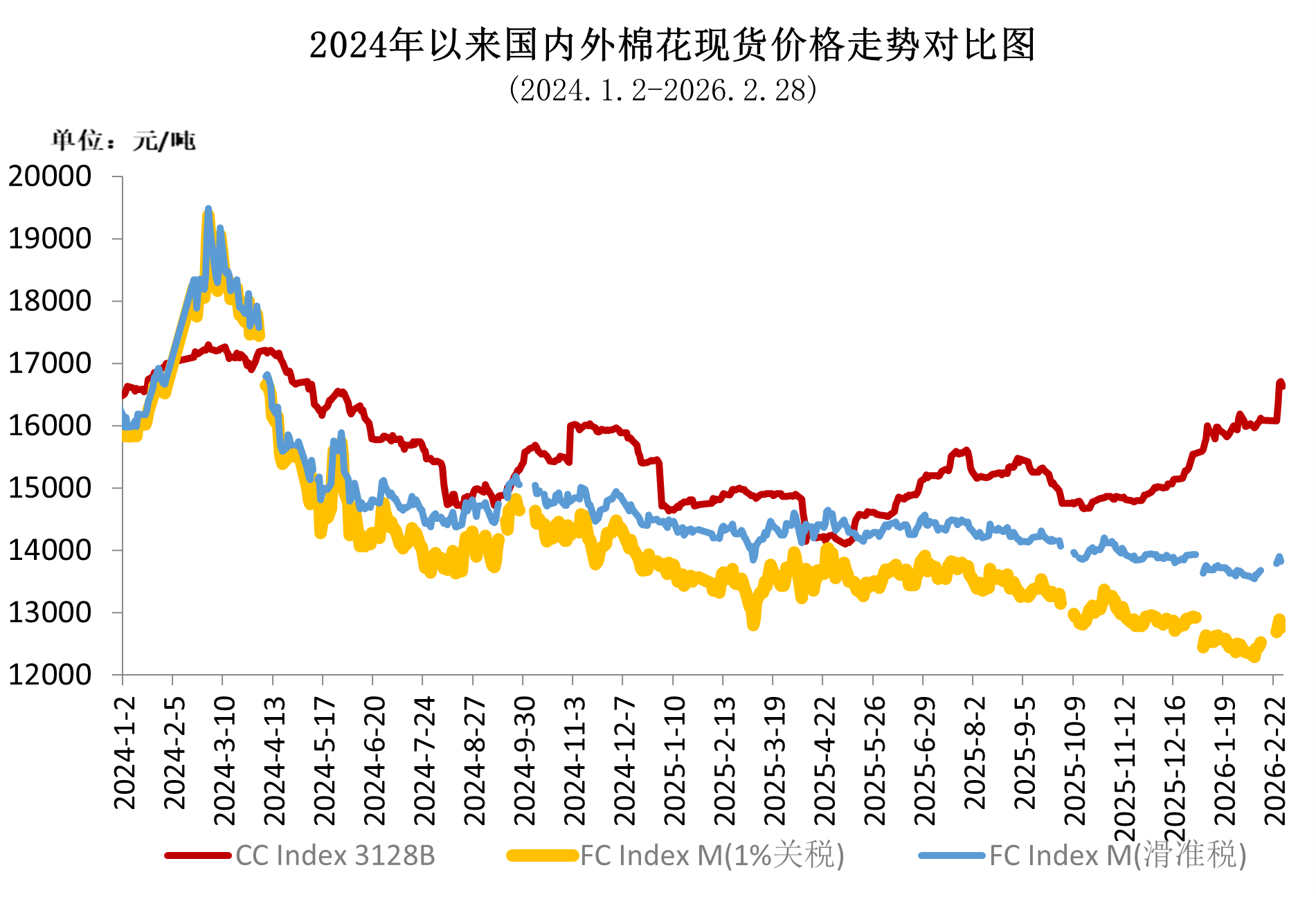 2月國(guó)內(nèi)外棉價(jià)均呈上行走勢(shì)。國(guó)內(nèi)棉價(jià)節(jié)前受春節(jié)假期影響小幅波動(dòng),節(jié)后在紡織廠復(fù)工復(fù)產(chǎn)、外盤上漲的推動(dòng)下強(qiáng)勢(shì)回升;國(guó)際市場(chǎng)先抑后揚(yáng),前期受地緣沖突拖累走弱,中下旬因產(chǎn)需收緊預(yù)期、美國(guó)關(guān)稅政策變化等因素實(shí)現(xiàn)反彈,但漲幅不及國(guó)內(nèi),內(nèi)外棉價(jià)差持續(xù)擴(kuò)大。