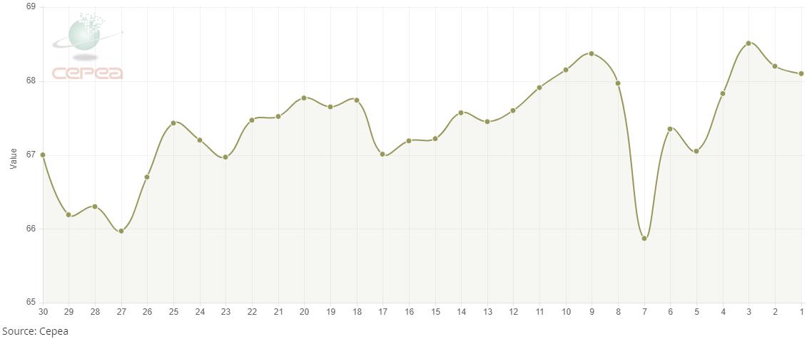 3月11日(周三),巴西CEPEA/ESALQ棉花價格指數(shù)報68.10美分/磅,較前一交易日下跌0.15%,較上月同期下跌0.39%。