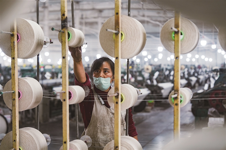 3月10日,呼圖壁縣云龍棉業(yè)集團有限公司紡紗車間,工人正在作業(yè)。
