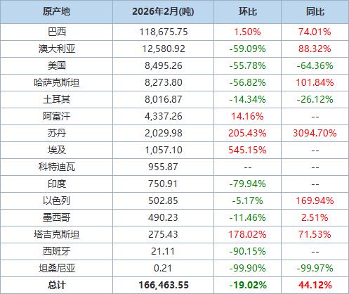 據(jù)海關(guān)統(tǒng)計數(shù)據(jù),2026年2月我國進(jìn)口棉花約17萬噸,環(huán)比減少約4萬噸,同比增長約44.1%。
