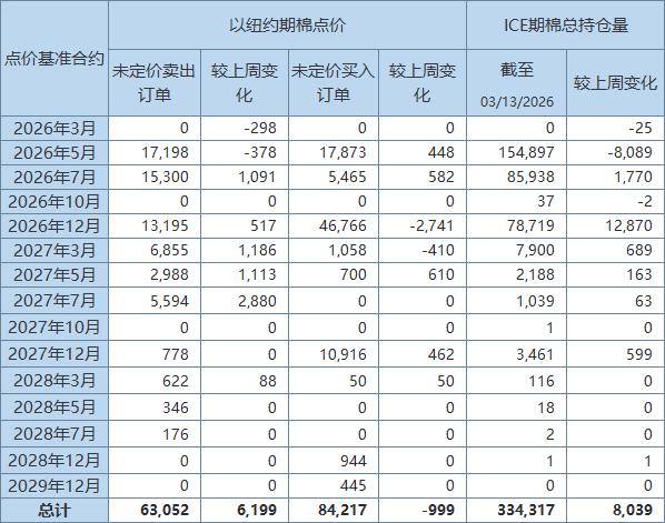 3月19日(周四),美國(guó)商品期貨交易委員會(huì)(CFTC)周四公布,截至3月13日,以ICE期棉2026年5月合約點(diǎn)價(jià)未定價(jià)賣出訂單(UnfixedCallSales)較前周減少378手至17198手。