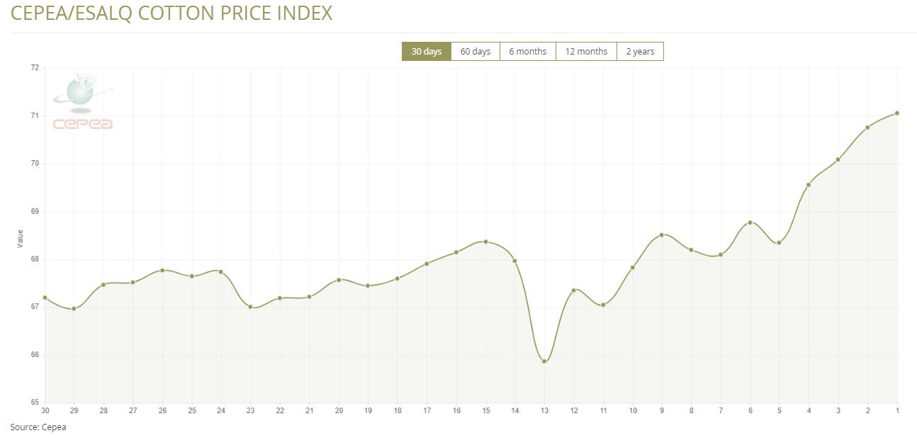 3月19日(周四),巴西CEPEA/ESALQ棉花價格指數(shù)報71.06美分/磅,較前一交易日上漲0.42%,較上月同期上漲3.93%。