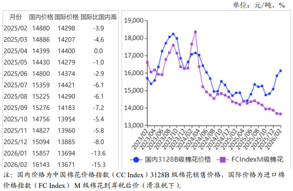 (一)國(guó)內(nèi)棉價(jià)環(huán)比上漲。新疆維吾爾自治區(qū)政府工作報(bào)告中提出,2026年新疆棉花總產(chǎn)穩(wěn)定在560萬(wàn)噸左右(較2025年616.5萬(wàn)噸減9.2%),市場(chǎng)預(yù)期2026年棉花供應(yīng)持續(xù)收緊。2月,國(guó)內(nèi)3128B級(jí)棉花月均價(jià)每噸16143元,環(huán)比漲1.8%,同比漲8.5%。鄭棉期貨主力合約CF605月結(jié)算價(jià)每噸15330元,環(huán)比漲3.9%,同比漲10.7%。