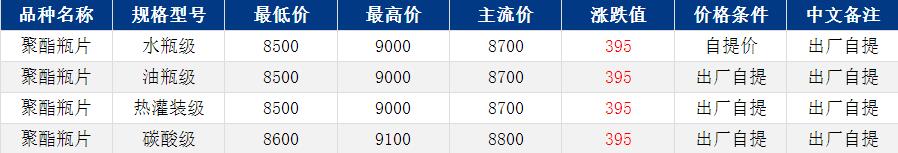 華東聚酯瓶片收于8700元/噸,漲跌值395元/噸,原油帶動(dòng)原料上行,聚酯瓶片隨成本端上揚(yáng)。3月貨源報(bào)盤8600-9000元/噸,局部略低8450元/噸左右;遞盤8400-8450元/噸;或期貨合約2605升水150至350,品牌價(jià)差較大,行情波動(dòng)劇烈,下游買氣偏弱。