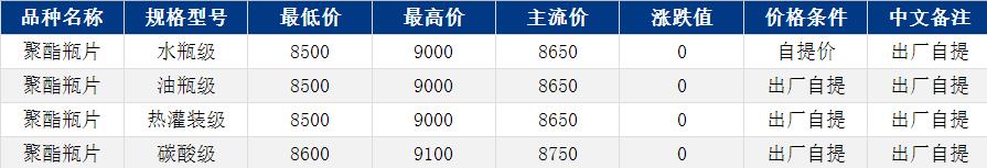 華東聚酯瓶片收于8650元/噸,漲跌值0元/噸,原油開盤大漲,原料支撐有限。然而部分貨源流通緊張,聚酯瓶片暫時持穩(wěn)。3月貨源報盤8450-9000元/噸或期貨合約2605升水80-300,遞盤8450-8650元/噸,下游買氣偏弱,零星實單遞盤。