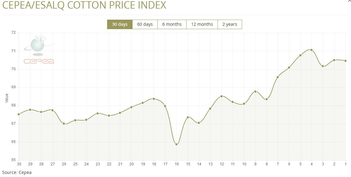 3月24日(周二),巴西CEPEA/ESALQ棉花價(jià)格指數(shù)報(bào)70.46美分/磅,較前一交易日小跌0.06%,較上月同期上漲3.06%。
