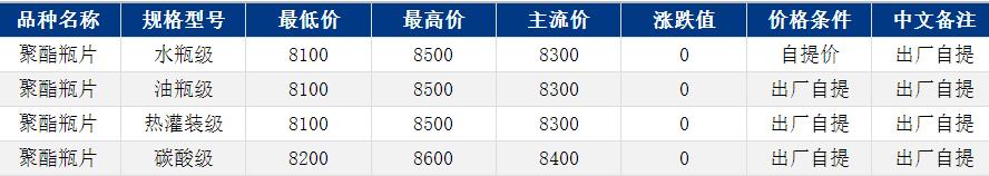 華東聚酯瓶片收于8300元/噸,漲跌值0元/噸,原料存一定支撐,聚酯瓶片工廠多報穩(wěn),重心僵持整理。3-4月貨源報盤8100-8500元/噸,局部略低8050元/噸附近。零星實單遞盤8050元/噸,業(yè)內(nèi)觀望情緒濃厚。