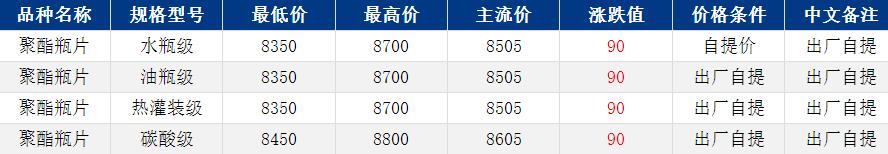 華東聚酯瓶片收于8505元/噸,漲跌值90元/噸,原料支撐,聚酯瓶片工廠報(bào)價(jià)上調(diào)200元/噸,部分現(xiàn)貨供應(yīng)緊張,市場(chǎng)重心隨之上揚(yáng)。3-4月貨源報(bào)盤8350-8700元/噸,零星遞盤8450元/噸。擔(dān)憂行情會(huì)有反復(fù),下游買氣偏弱,謹(jǐn)慎觀望為主。