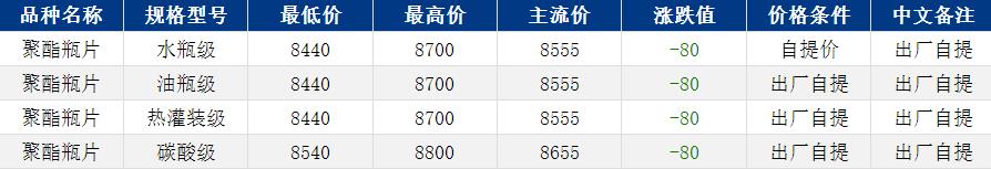 華東聚酯瓶片收于8555元/噸,漲跌值-80元/噸,外圍消息發(fā)酵,能化品全線回調(diào),成本支撐坍塌,聚酯瓶片工廠報價多下調(diào)200元/噸。然而現(xiàn)貨資源略緊,市場價格較原料相對抗跌,4月貨源報盤8440-8700元/噸或期貨合約2605升水300-400,局部略低8200-8240元/噸或2605升水50。缺少明確方向指導(dǎo),暫無實單遞盤,謹(jǐn)慎觀望為主。