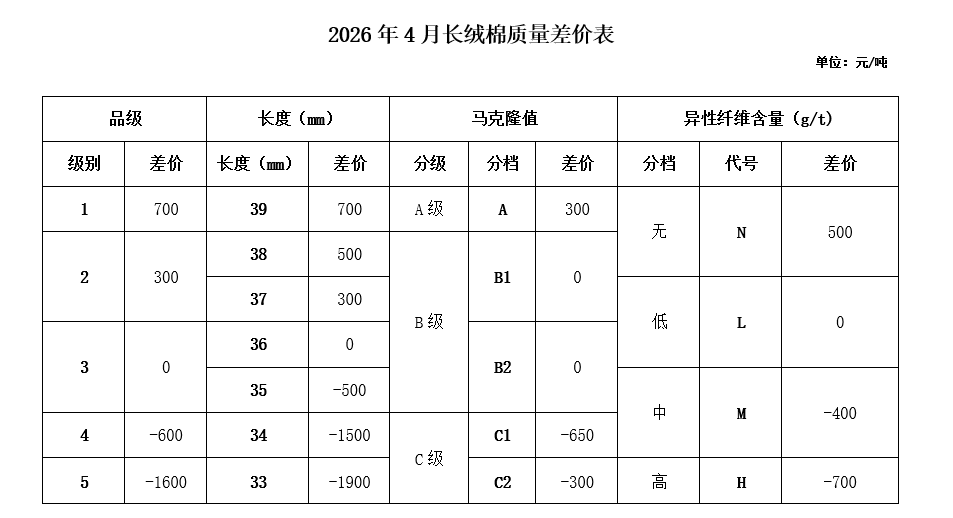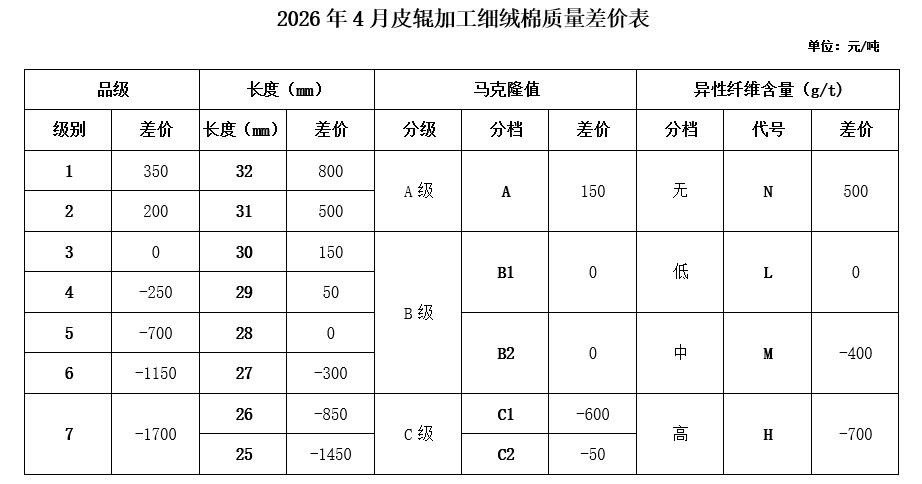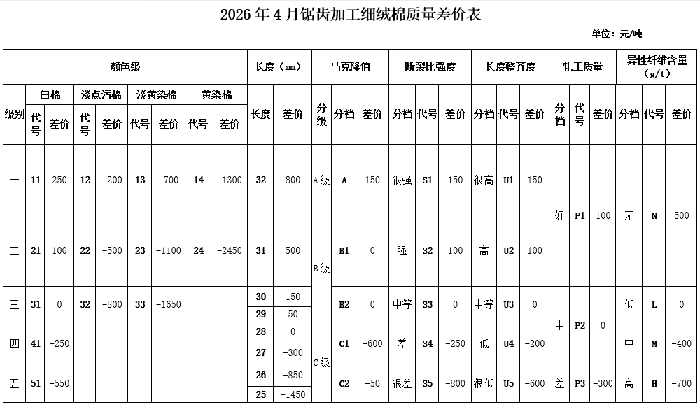 根據(jù)《中國棉花協(xié)會國產(chǎn)棉質(zhì)量差價表管理辦法》規(guī)定,現(xiàn)正式發(fā)布2026年4月《鋸齒加工細絨棉質(zhì)量差價表》、《皮輥加工細絨棉質(zhì)量差價表》、《長絨棉質(zhì)量差價表》(單位:元/噸)。
