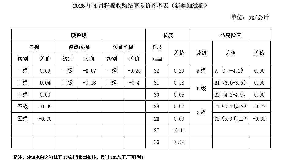 依據(jù)中國(guó)棉花協(xié)會(huì)發(fā)布的2026年4月《鋸齒加工細(xì)絨棉質(zhì)量差價(jià)表》和2025年9月-2026年3月新疆籽棉平均公定衣分率,折算得出籽棉收購(gòu)差價(jià),與上月相比,做如下調(diào)整: