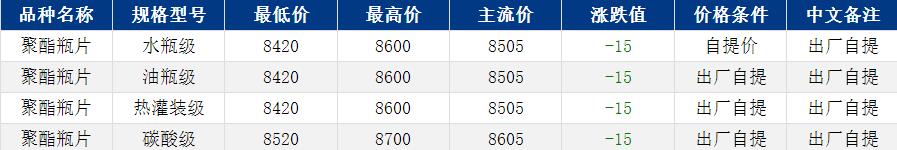 華東聚酯瓶片收于8505元/噸,漲跌值-15元/噸,受中東局勢緩和消息影響,能化產(chǎn)品整體回調(diào)。聚酯瓶片價格窄幅下滑,4月主流貨源報盤8420-8600元/噸或期貨合約2605升水300-400,部分略低8220-8400元/噸,暫無實單遞盤。業(yè)內(nèi)觀望情緒濃厚。