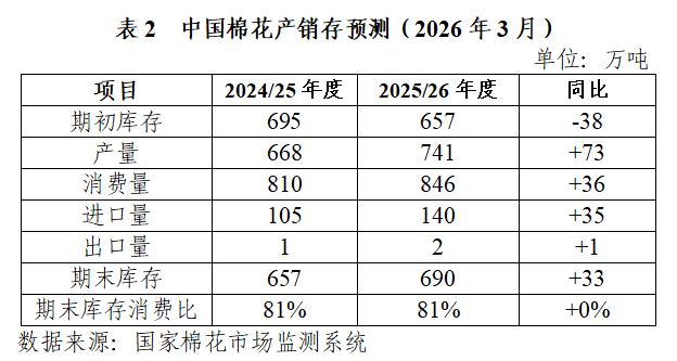 2025/26年度國(guó)內(nèi)棉花加工檢驗(yàn)進(jìn)入尾聲,截至3月26日,全國(guó)棉花累計(jì)檢驗(yàn)量760.6萬(wàn)噸,同比增長(zhǎng)12.3%;累計(jì)銷(xiāo)售率79.2%,同比提高17.5個(gè)百分點(diǎn),較過(guò)去四年均值提高20.9個(gè)百分點(diǎn)。國(guó)家發(fā)展改革委于3月16日宣布增發(fā)30萬(wàn)噸滑準(zhǔn)稅配額,有效補(bǔ)充紡織旺季企業(yè)對(duì)進(jìn)口棉的采購(gòu)需求。截至2月,2025/26年度我國(guó)進(jìn)口棉花87萬(wàn)噸,同比增長(zhǎng)約16%;進(jìn)口棉紗88萬(wàn)噸,同比增長(zhǎng)約24%。據(jù)此,本期中國(guó)棉花產(chǎn)銷(xiāo)存預(yù)測(cè)平衡表上調(diào)棉花消費(fèi)量和進(jìn)口量30萬(wàn)噸。國(guó)內(nèi)棉花進(jìn)入生產(chǎn)備播關(guān)鍵期,新疆縮減棉花種植面積的趨勢(shì)基本明確,新年度我國(guó)棉花產(chǎn)量下降預(yù)期較強(qiáng)。新一輪目標(biāo)價(jià)格政策即將公布,需高度關(guān)注政策實(shí)際調(diào)整方向。