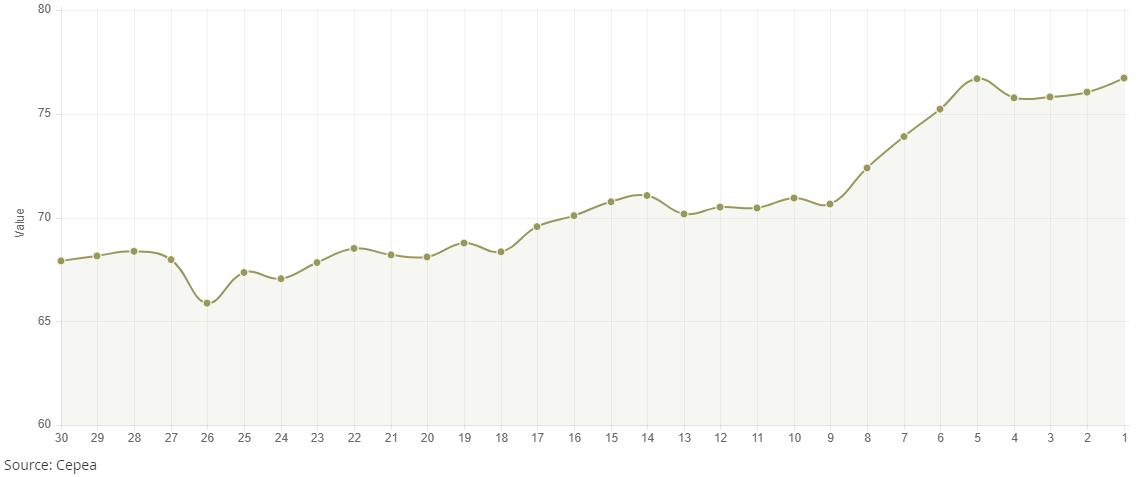 4月8日(周三),巴西CEPEA/ESALQ棉花價格指數(shù)報76.72美分/磅,較前一交易日上漲0.89%,較上月同期上漲1.99%。