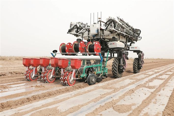 4月10日,一師二團二十六連農(nóng)田里,一臺由覺物科技(深圳)有限公司研發(fā)的FR鶴出T3000播種機器人在播種棉花。該播種機器人適用多種地形,能高效完成鋪膜、鋪滴灌帶、播種、覆土等工序。近年來,一師阿拉爾市積極推廣應(yīng)用智能化、便捷化、國產(chǎn)化農(nóng)業(yè)科技裝備,以科技賦能農(nóng)業(yè)生產(chǎn),助力豐產(chǎn)豐收。