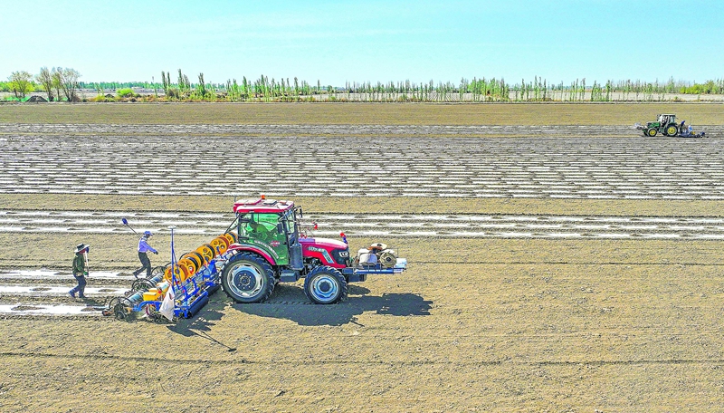 4月10日,大型播種機在尉犁縣古勒巴格鄉(xiāng)巴西買里村的高標準棉田里播種(無人機照片)。近日,在尉犁縣古勒巴格鄉(xiāng)的高標準棉田里,種植戶利用晴好天氣有條不紊開展播種作業(yè)。今年尉犁縣采用“干播濕出”“精量播種”等多種播種技術(shù),計劃種植棉花100萬畝。