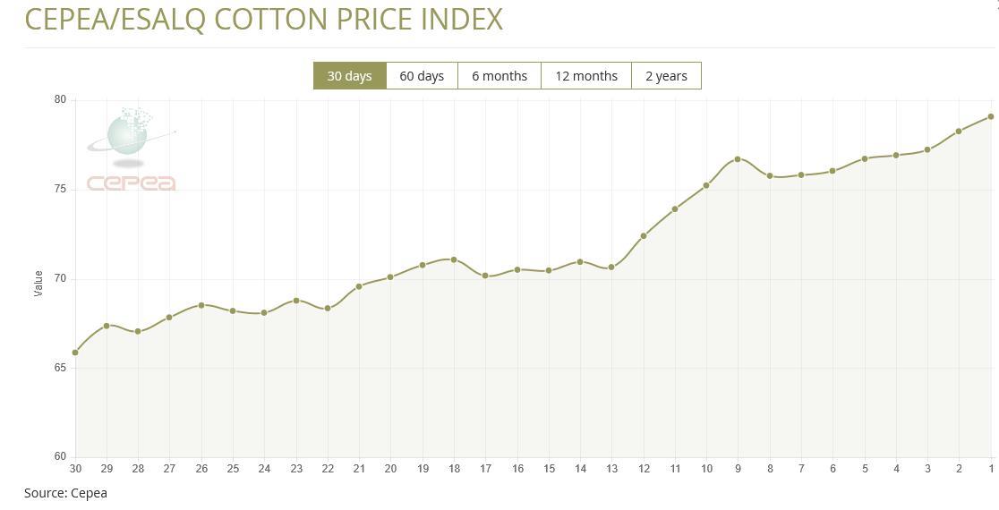 4月14日(周二),巴西CEPEA/ESALQ棉花價(jià)格指數(shù)報(bào)79.09美分/磅,較前一交易日上漲1.06%,較上月同期上漲5.14%。