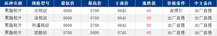 華東聚酯瓶片收于8645元/噸,漲跌值60元/噸,市場擔(dān)憂供應(yīng)緊張,原料強勢上漲,帶動聚酯瓶片重心上揚。4月貨源報盤8600-8700元/噸,遞盤8530-8550元/噸;基差報盤2606升水550-600,部分略低在8350元/噸或2605升水200。