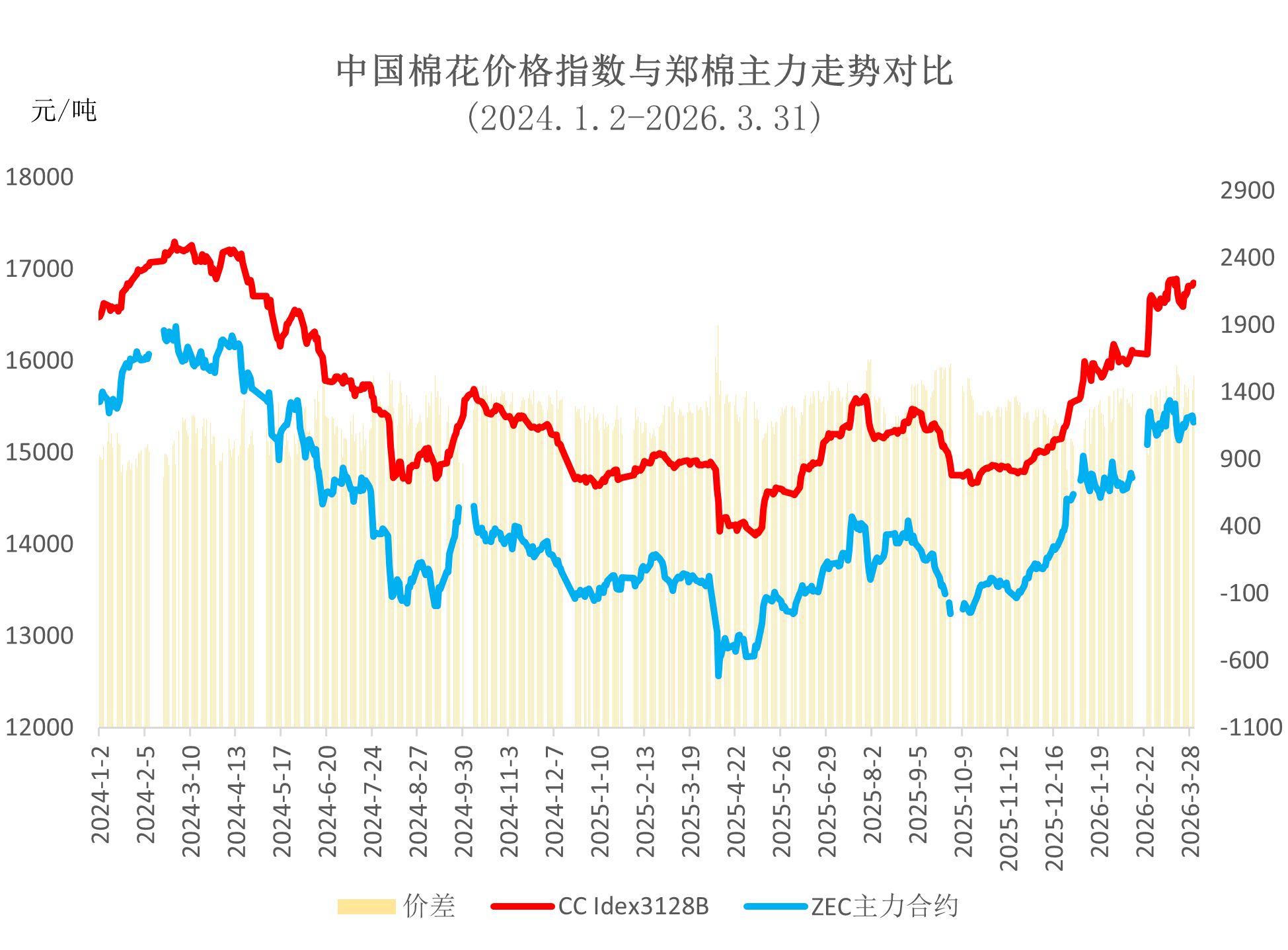 受多重利多因素共振,3月國(guó)內(nèi)外棉價(jià)均上行。中東局勢(shì)升級(jí)推升國(guó)際油價(jià)、海運(yùn)費(fèi)用,導(dǎo)致化纖成本大幅攀升,對(duì)棉花的替代優(yōu)勢(shì)顯著削弱;同時(shí)化肥價(jià)格走高抬升棉花種植成本,為棉價(jià)提供成本支撐,中國(guó)棉花價(jià)格指數(shù)創(chuàng)近2年新高。月中有關(guān)部門(mén)增發(fā)滑準(zhǔn)稅配額,進(jìn)一步提振外棉走勢(shì),對(duì)國(guó)內(nèi)棉價(jià)則形成階段性抑制,內(nèi)外棉價(jià)差有所收窄,但仍維持高位運(yùn)行。