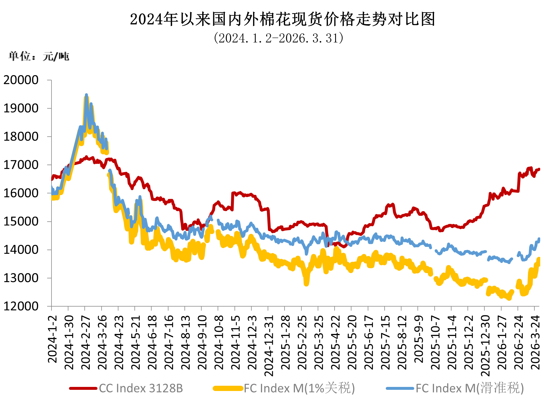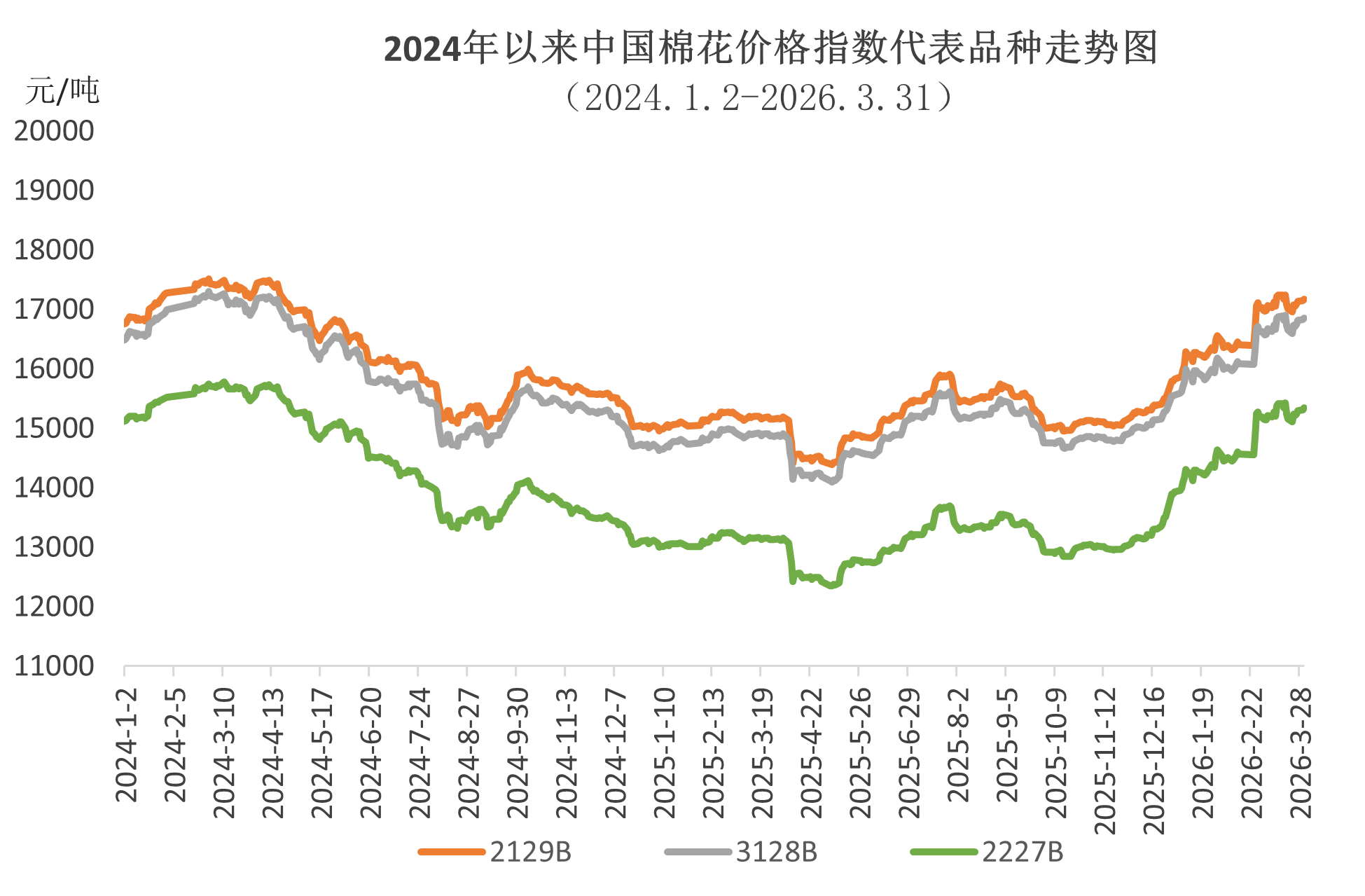 3月紡織市場(chǎng)傳統(tǒng)旺季行情逐步啟動(dòng),內(nèi)外需求持續(xù)回暖,疊加中東地緣局勢(shì)影響,中國(guó)棉花價(jià)格指數(shù)震蕩上行,3月18日收于16897元/噸,創(chuàng)近2年以來(lái)新高;中下旬國(guó)家有關(guān)部門(mén)增發(fā)30萬(wàn)噸加工貿(mào)易滑準(zhǔn)稅棉花進(jìn)口配額,有效緩解國(guó)內(nèi)棉花供應(yīng)趨緊預(yù)期,國(guó)內(nèi)棉價(jià)短暫回落,紡織廠積極補(bǔ)庫(kù),推動(dòng)月末棉價(jià)再度反彈,全月價(jià)格重心整體上移。中國(guó)棉花價(jià)格指數(shù)月均價(jià)16730元/噸,環(huán)比上漲556元,同比上漲1845元。