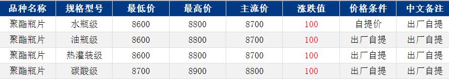 華東聚酯瓶片收于8700元/噸,漲跌值100元/噸,現(xiàn)貨供應(yīng)緊張,聚酯瓶片重心上揚(yáng)。4月貨源報(bào)盤8600-8800元/噸,部分略低8300-8450元/噸,下游、貿(mào)易商買氣弱,未聞實(shí)單遞盤。