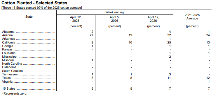 據(jù)美國(guó)農(nóng)業(yè)部網(wǎng)站消息,美國(guó)農(nóng)業(yè)部(USDA)在每周作物生長(zhǎng)報(bào)告中公布稱,截至2026年4月19日當(dāng)周,美棉種植率為11%,前周為7%,去年同期為10%,五年均值為10%。