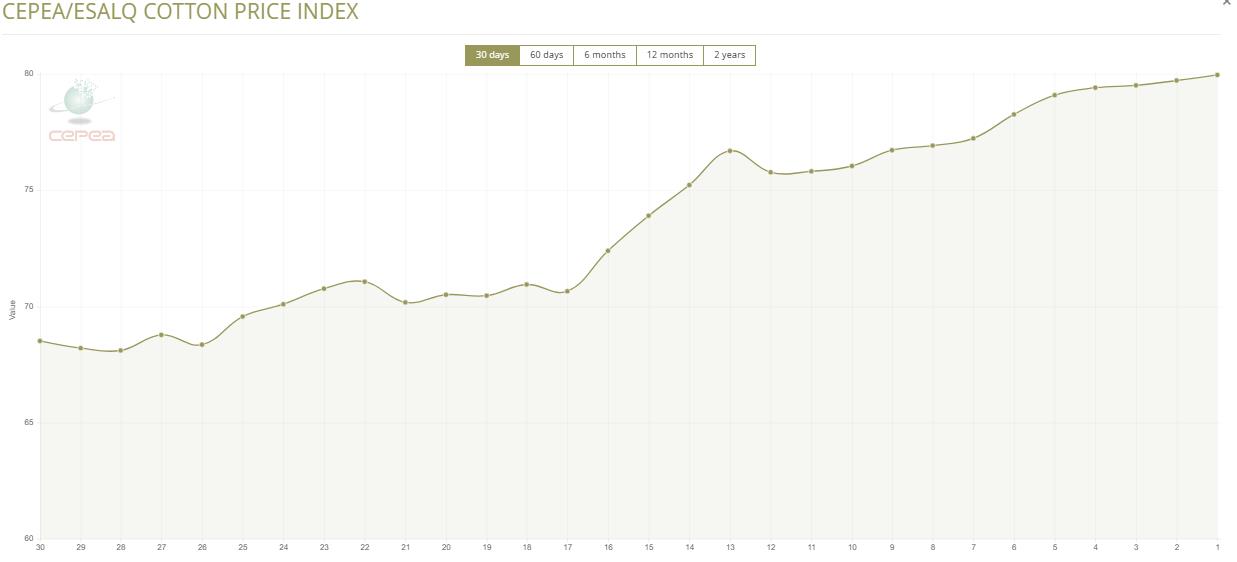 4月20日(周一),巴西CEPEA/ESALQ棉花價(jià)格指數(shù)報(bào)79.96美分/磅,較前一交易日上漲0.3%,較上月同期上漲6.3%。