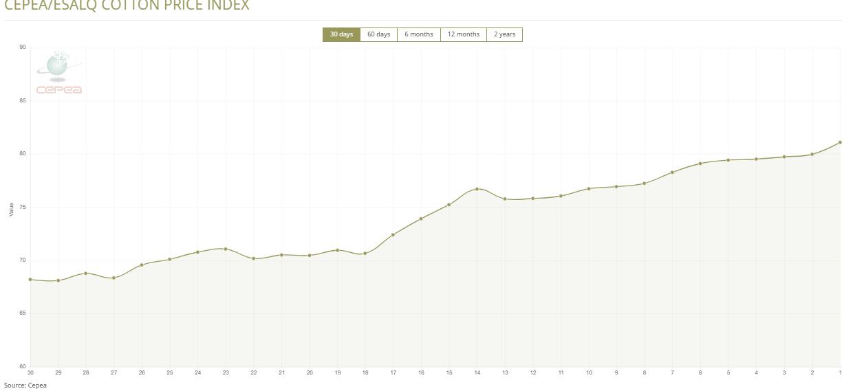 4月22日(周三),巴西CEPEA/ESALQ棉花價格指數(shù)報81.08美分/磅,較前一交易日上漲1.4%,較上月同期上漲7.79%。
