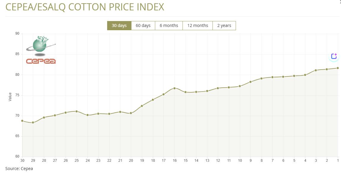 4月24日(周五),巴西CEPEA/ESALQ棉花價格指數(shù)報81.64美分/磅,較前一交易日上漲0.37%,較上月同期上漲8.53%。
