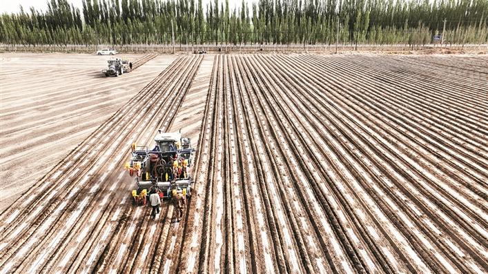 三師五○團(tuán)十八連棉花播種場景(攝于4月23日)。今年,北斗導(dǎo)航、智能農(nóng)機(jī)、智慧管控等新技術(shù)新裝備的全面應(yīng)用,大大加快三師圖木舒克市95萬畝棉花播種進(jìn)度。