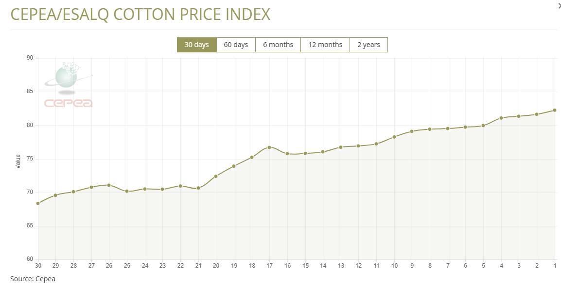 4月27日(周一),巴西CEPEA/ESALQ棉花價格指數(shù)報82.25美分/磅,較前一交易日上漲0.75%,較上月同期上漲9.35%。