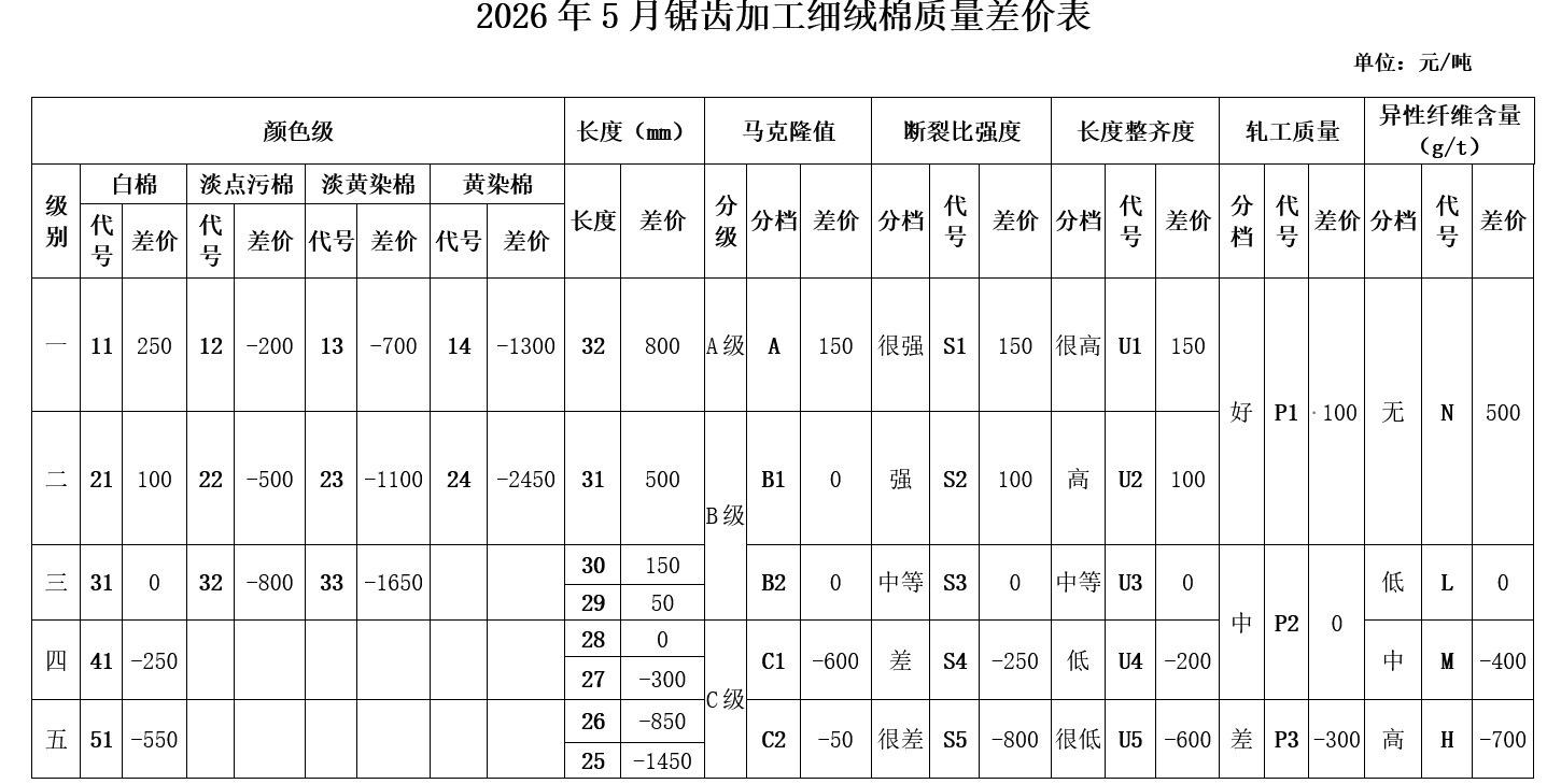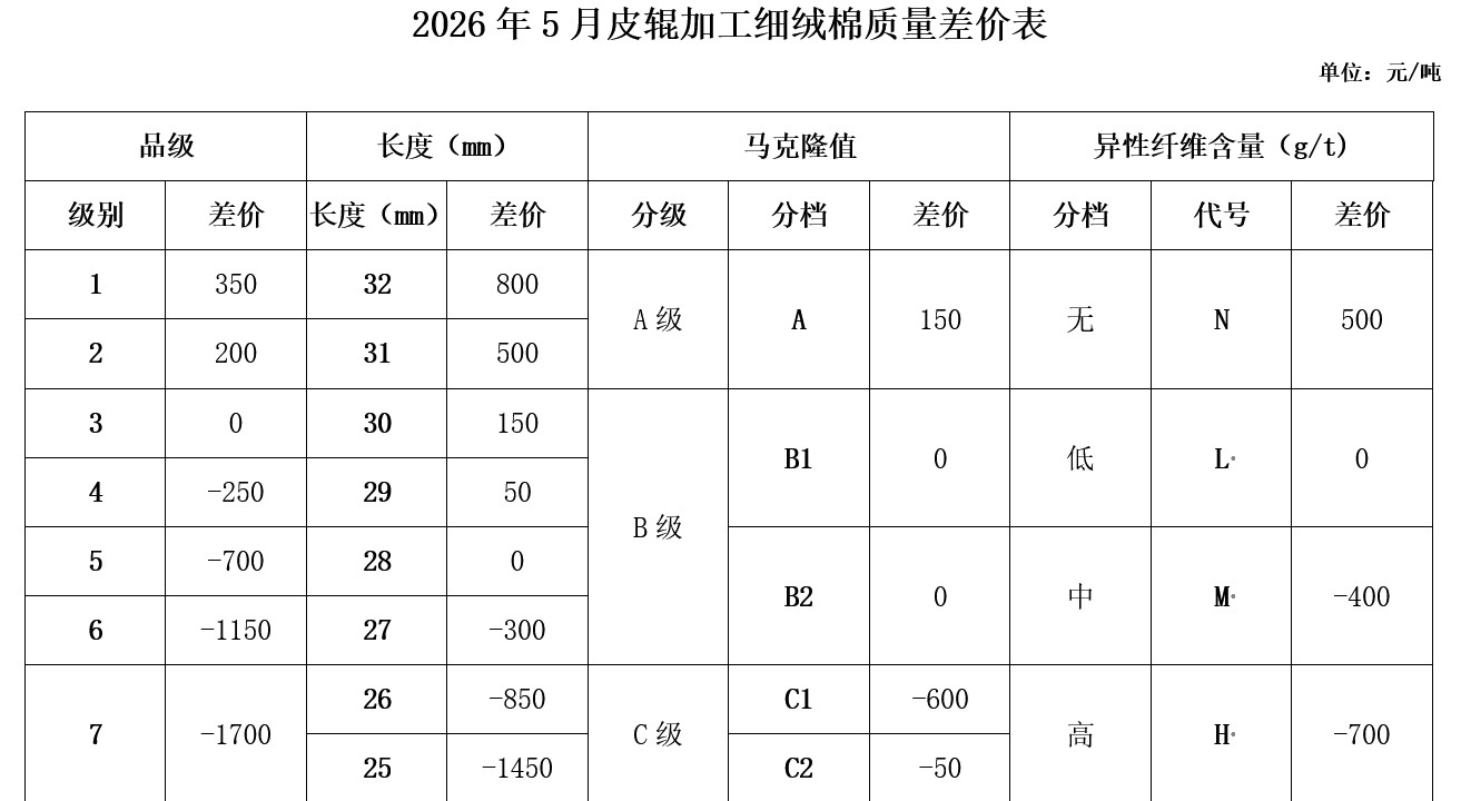 根據(jù)《中國棉花協(xié)會國產(chǎn)棉質(zhì)量差價表管理辦法》規(guī)定,現(xiàn)正式發(fā)布2026年5月《鋸齒加工細(xì)絨棉質(zhì)量差價表》、《皮輥加工細(xì)絨棉質(zhì)量差價表》、《長絨棉質(zhì)量差價表》(單位:元/噸)。