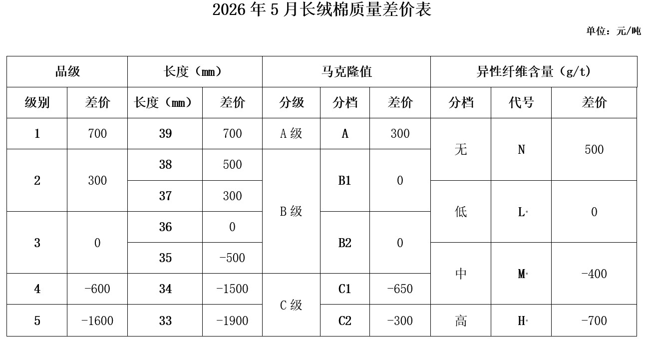 依據(jù)2026年4月的棉花公檢質(zhì)量數(shù)據(jù)、中國棉花協(xié)會質(zhì)量差價系統(tǒng)采集的加工企業(yè)銷售價和紡織企業(yè)到廠價,及當(dāng)月的中國棉花價格指數(shù),并征求業(yè)內(nèi)相關(guān)專家的意見,與上月相比2026年5月《鋸齒加工細(xì)絨棉質(zhì)量差價表》、《皮輥加工細(xì)絨棉質(zhì)量差價表》、《長絨棉質(zhì)量差價表》差價均保持不變。