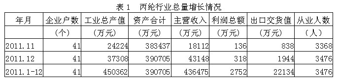 據(jù)國(guó)家統(tǒng)計(jì)局公布的數(shù)據(jù),2011年1-12月份我國(guó)規(guī)模以上丙綸行業(yè)上下游企業(yè)數(shù)量為41家,該行業(yè)實(shí)現(xiàn)工業(yè)總產(chǎn)值45.04億元,同比增加16.26%;資產(chǎn)合計(jì)39.07億元,同比增加16.15%;實(shí)現(xiàn)主營(yíng)收入43.65億元,同比增加16.28%;完成利潤(rùn)總額0.28億元,比上年同期減少14.598億元,同比減少42.23%;完成出口交貨值2.21億元,同比減少2.37%;行業(yè)整體從業(yè)人數(shù)0.35萬(wàn)人,同比增加4.87%。由此可見(jiàn),丙綸行業(yè)總量增長(zhǎng)勢(shì)頭良好,并為我國(guó)經(jīng)濟(jì)、財(cái)政、出口和就業(yè)作出了重大的貢獻(xiàn)。