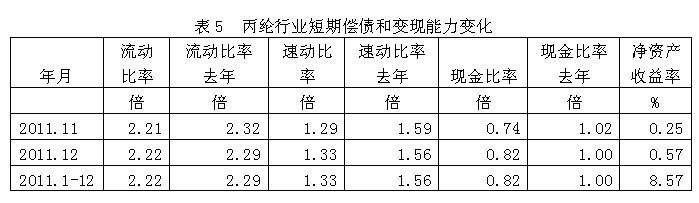 從短期償債和變現(xiàn)能力的變化看,丙綸行業(yè)流動(dòng)比率(流動(dòng)資產(chǎn)/流動(dòng)負(fù)債)2011年1-12月份為2.22倍,而上年同期為2.29倍,流動(dòng)比率較高,表明企業(yè)短期償債能力較強(qiáng);
