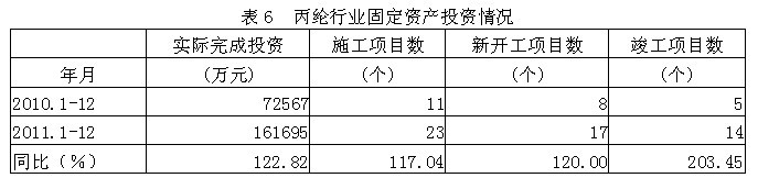據(jù)國(guó)家統(tǒng)計(jì)局公布的數(shù)據(jù),2011年1-12月份丙綸行業(yè)實(shí)際完成投資額16.17億元,同比增加122.82%;當(dāng)年以來(lái)到目前為止施工項(xiàng)目總數(shù)為23個(gè),同比增加117.04%;其中新開工項(xiàng)目數(shù)17個(gè),同比增加120.00%;截至12月底為止,已實(shí)現(xiàn)竣工項(xiàng)目數(shù)14個(gè),同比增加203.45%,占施工項(xiàng)目總數(shù)的60.07%,表明該行業(yè)投資項(xiàng)目進(jìn)展較好。