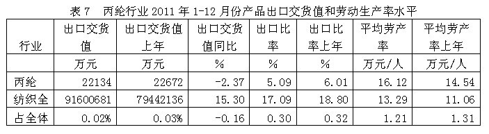 從行業(yè)產(chǎn)品出口交貨值和勞動(dòng)生產(chǎn)率水平看,2011年1-12月份丙綸行業(yè)產(chǎn)品出口交貨值為2.21億元,占紡織全行業(yè)的0.02%;出口交貨值比上年同期減少2.37%;該行業(yè)產(chǎn)品出口比率(出口交貨值/工業(yè)銷售產(chǎn)值)為5.09%,而上年同期為6.01%,表明該行業(yè)產(chǎn)品出口狀況較好;從勞動(dòng)生產(chǎn)率的水平看,2011年1-12月份丙綸行業(yè)平均勞產(chǎn)率(工業(yè)增加值/從業(yè)人數(shù))為16.12萬(wàn)元/人,而上年同期為14.54萬(wàn)元/人,表明該行業(yè)勞動(dòng)生產(chǎn)率的實(shí)際水平比較理想。