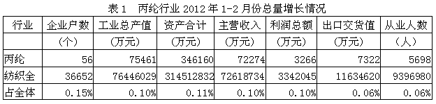 據(jù)國家統(tǒng)計(jì)局公布的數(shù)據(jù)(按往年慣例,1-2月份的經(jīng)濟(jì)指標(biāo)數(shù)據(jù)合并在一起),2012年1-2月份我國規(guī)模以上(自2011年起,規(guī)模以上企業(yè)劃分標(biāo)準(zhǔn)調(diào)整為年主營業(yè)務(wù)收入2000萬元及以上工業(yè)法人企業(yè))丙綸行業(yè)企業(yè)數(shù)量為56家,占紡織全行業(yè)的0.15%;工業(yè)總產(chǎn)值為7.55億元,占0.10%;資產(chǎn)合計(jì)為34.62億元,占0.11%;主營收入為7.23億元,占0.10%;利潤總額為0.33億元,占0.10%;出口交貨值為0.73億元,占0.06%;從業(yè)人數(shù)為0.57萬人,占0.06%。由此可見,丙綸行業(yè)總產(chǎn)值、總資產(chǎn)、主營收入、利潤總額、出口和就業(yè)均給紡織全行業(yè)作出了一點(diǎn)貢獻(xiàn)。
