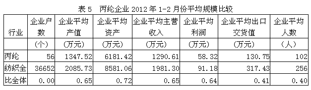 從企業(yè)平均規(guī)模的變化情況看,2012年1-2月份丙綸企業(yè)平均產(chǎn)值為1348萬元,為紡織全行業(yè)平均數(shù)的0.65倍;企業(yè)平均資產(chǎn)為6181萬元,為行業(yè)平均數(shù)的0.72倍;企業(yè)平均主營收入為1291萬元,為行業(yè)平均數(shù)的0.65倍;企業(yè)平均利潤為58.32萬元,為行業(yè)平均數(shù)的0.64倍;企業(yè)平均出口交貨值為130.75萬元,為行業(yè)平均數(shù)的0.41倍;企業(yè)平均人數(shù)為102人,為行業(yè)平均數(shù)的0.40倍。由此可見,丙綸企業(yè)的平均規(guī)模低于紡織全行業(yè)的平均水平,反映該行業(yè)中小企業(yè)較多,與該行業(yè)的特點(diǎn)比較接近。
