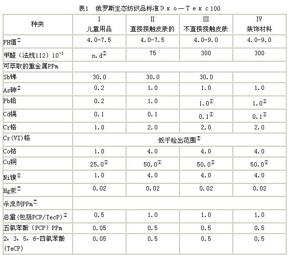 紡織品較突出的問題是甲醛含量,1996年以前俄羅斯使用的前蘇聯(lián)標準,在紡織材料(兒童品種)上就已經(jīng)規(guī)定了甲醛的零含量。從1997年7月1日起,俄羅斯正式頒布了生態(tài)紡織品標準Эко—Текс100,它作為俄羅斯紡織行業(yè)的生態(tài)標準,對于紡織品的質(zhì)量和使用安全性具有權(quán)威性,獲得國際紡織生態(tài)檢驗機構(gòu)的認可,該標準中規(guī)定了紡織品有害物質(zhì)的允許含量。見表1。目前俄羅斯紡織行業(yè)的生態(tài)標準有三部分:《Эко—Текс100標準》,用于紡織品有害物質(zhì)的檢驗、評定;《Эко—Текс100標準》,用于紡織品有害物質(zhì)的檢驗、評定;《Эко—Текс100標準指引》,用于紡織品制造過程的生態(tài)控制;《Эко—Текс1000標準》,用于無污染的紡織企業(yè)。